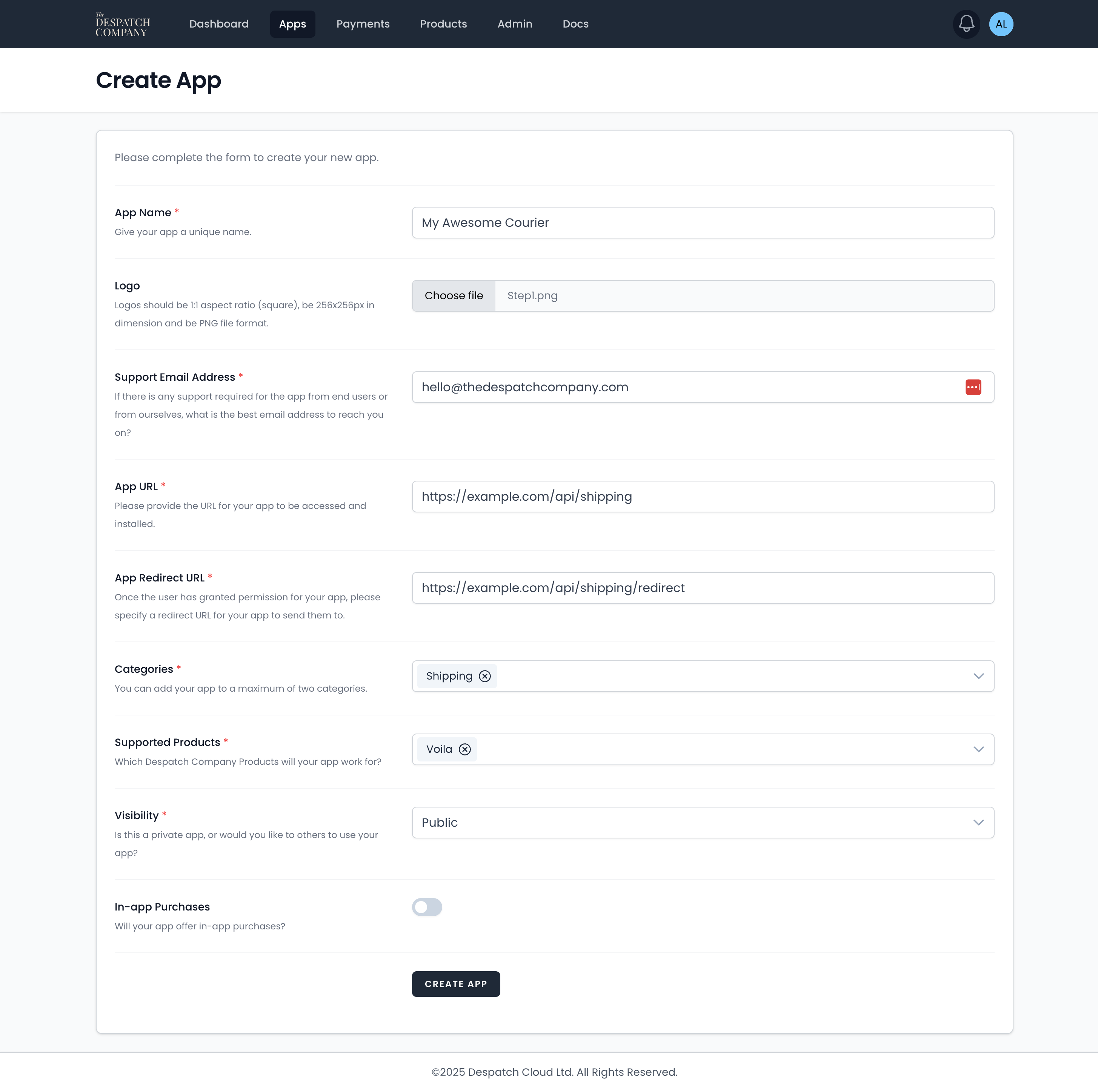 Fill out the form with your app’s name, logo, and categories. If you’re building a courier integration, make sure “Voila” is the only product selected under Supported Products.
